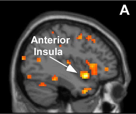 This is an overall fMRI composite comparison of the brains of highly sensitive people (HSP) compared to non-HSPs. The areas in color represent some of the regions of the brain where greater activation occurs in HSPs compared to non-HSPs. The brain region highly associated with empathy and noticing emotion (Anterior Insula) shows significantly greater activation in HSPs than non-HSPs when viewing a photo of their partner smiling.[/caption]