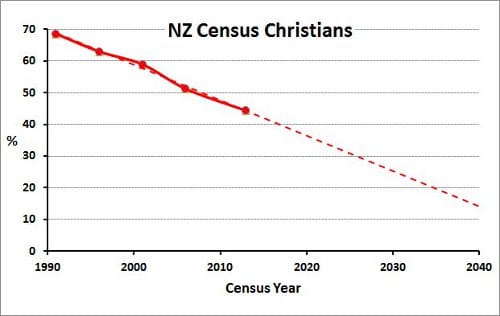 The results of the 2013 New Zealand Census has Christianity down to 47 per cent. Retired scientist, Ken Perrott's, accompanying graph charts Christianity's decline in every recent census and projects its decline to just above 20 per cent by 2030 and further, beyond that date. It is, of course, very